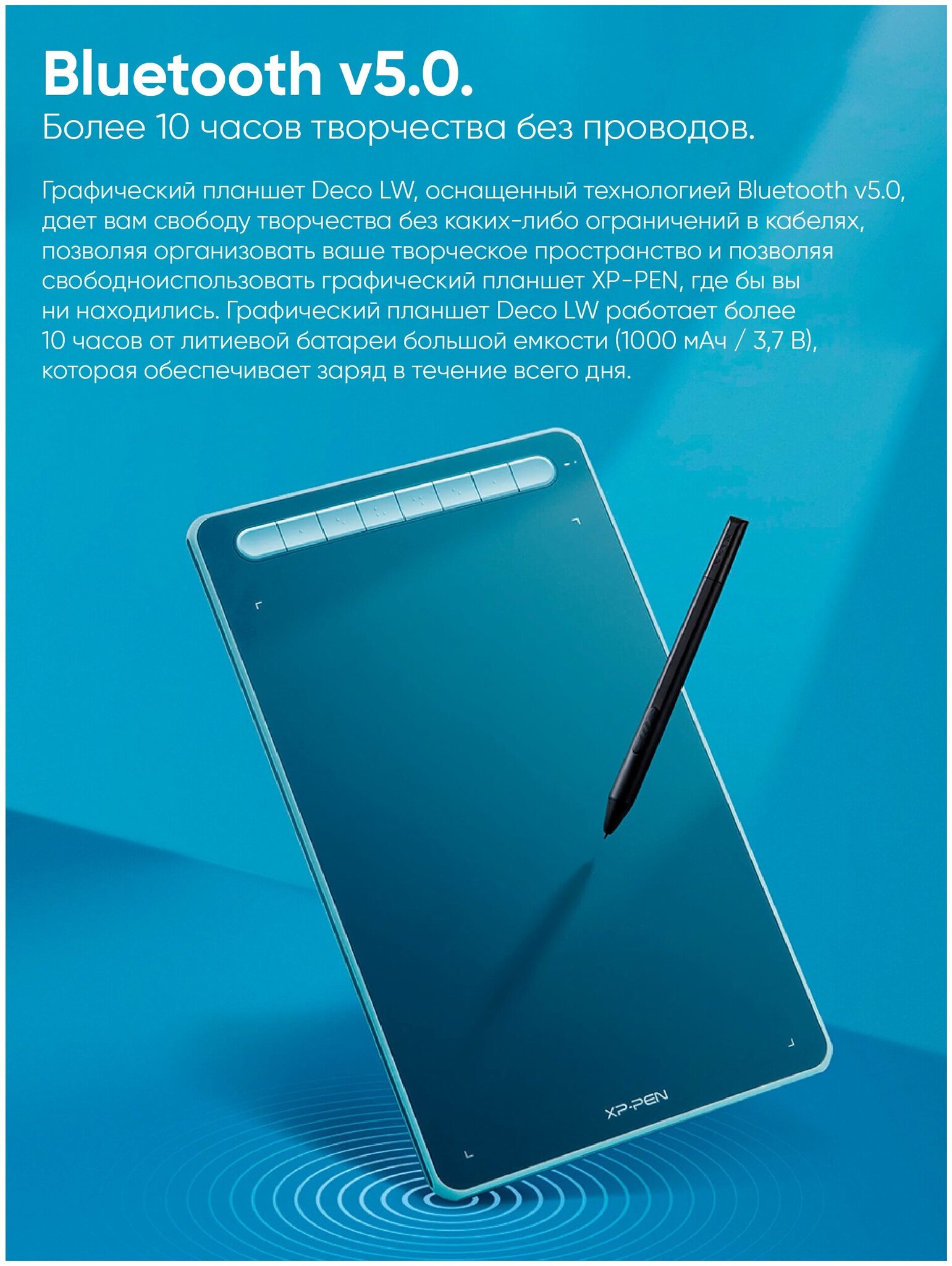 Графические планшеты Deco LW-Новое поколение графических планшетов. Больше, чем просто умный! LW, оснащенный технологией Bluetooth v5.0 и работает более 10 часов от литиевой батареи большой емкости! Новый стилус с чипом Х3 - это новые возможности для рисования с более тонкой чувствительностью к нажатию и гораздо более коротким втягиванием наконечника. Его точность сопоставима с карандашом. Графические планшеты работают с большинством программ для рисования, включая Adobe Photoshop, Illustrator, SAI, GIMP, Krita, MediBang Paint, FireAlpaca, Blender и другие, а так же поддерживают операционные системы Windows, Mac, Android, Chrome OS и Linux. Такая совместимость расширяет ваши творческие горизонты! Восемь горячих клавиш, которые можно настроить в соответствии с необходимыми сочетаниями для различных команд, заменяя, таким образом, клавиатуру компьютера. Тактильно ощутимые выступы на клавишах позволяют быстро вслепую определить правильную даже в темноте, помогая ускорить рабочий процесс.
