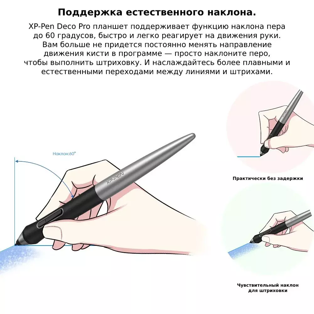 XP-Pen Deco Pro планшет поддерживает функцию наклона пера до 60 градусов, быстро и легко реагирует на движения руки. Вам больше не придется постоянно менять направление движения кисти в программе — просто наклоните перо, чтобы выполнить штриховку. И наслаждайтесь более плавными и естественными переходами между линиями и штрихами.