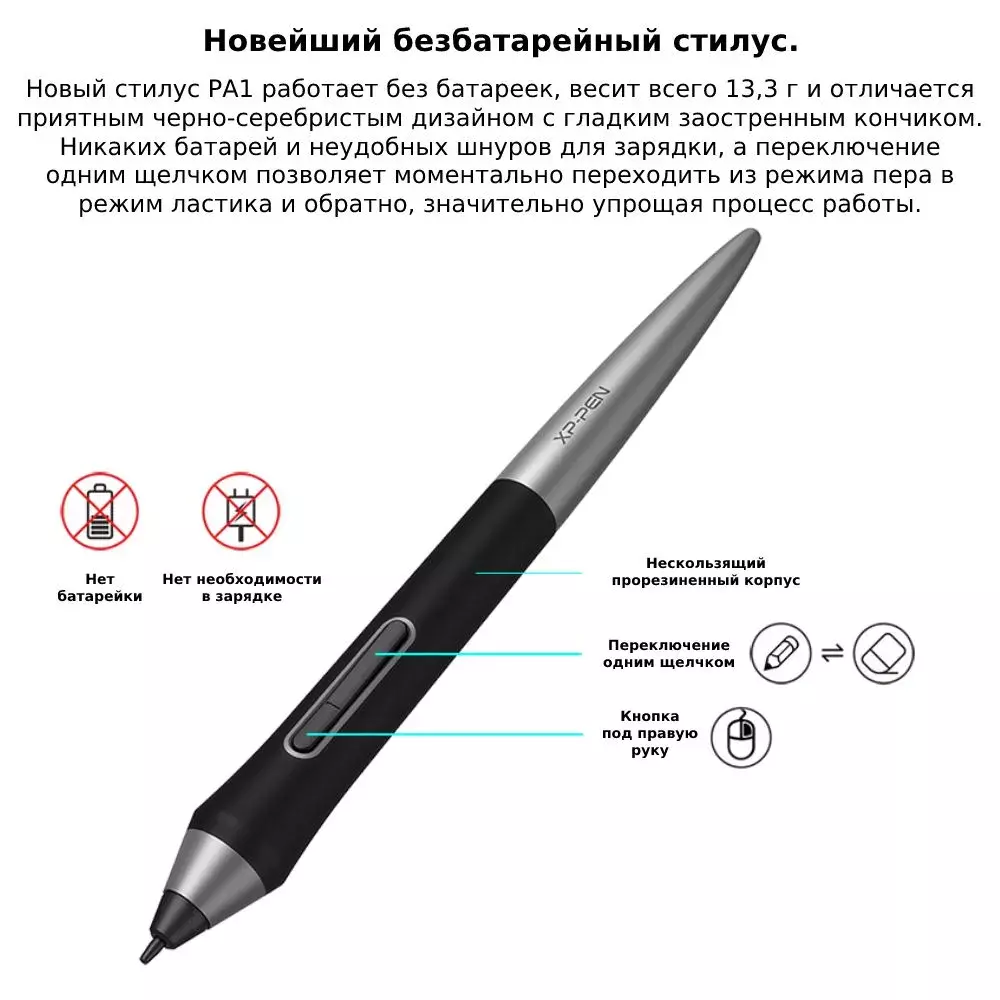 Новый стилус PA1 работает без батареек, весит всего 13,3 г и отличается приятным черно-серебристым дизайном с гладким заостренным кончиком. Никаких батарей и неудобных шнуров для зарядки, а переключение одним щелчком позволяет моментально переходить из режима пера в режим ластика и обратно, значительно упрощая процесс работы.