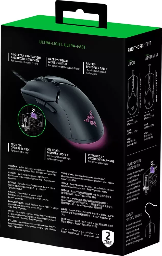 Достигните следующего уровня абсолютного контроля с Razer Viper 8KHz - симметричной игровой мышью для киберспорта с истинной частотой опроса 8000 Гц для максимальной скорости и минимальной задержки из когда-либо достигнутых. С усовершенствованной оптическими переключателями Razer™ 2-го поколения мышью, пришло время встать на ноги и оставить все позади.
