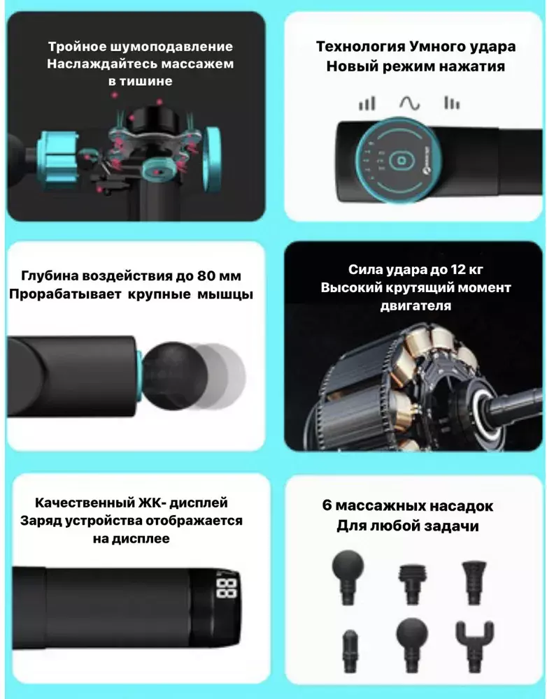 Многофункциональный беспроводной ручной массажер для проникающего перкуссионного и миофасциального массажа всего тела. Универсальный массажёр походит для мужчин и женщин. Воздействует на все группы мышц и верхние слои сухожилий. Благодаря усиленным направленным вибрирующим пульсациям массажер помогает снять мышечную болезненность и жесткость мышц после физических нагрузок, улучшает диапазон движения, способствует циркуляции крови, ускоряет разогрев и восстановление после спортивных занятий, способствует избавлению от целлюлита, расслабляет все тело.